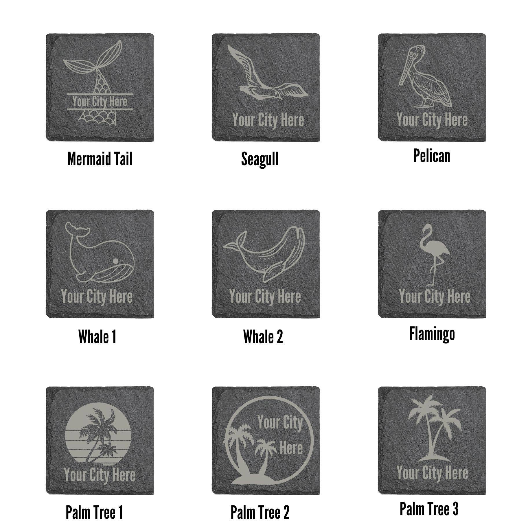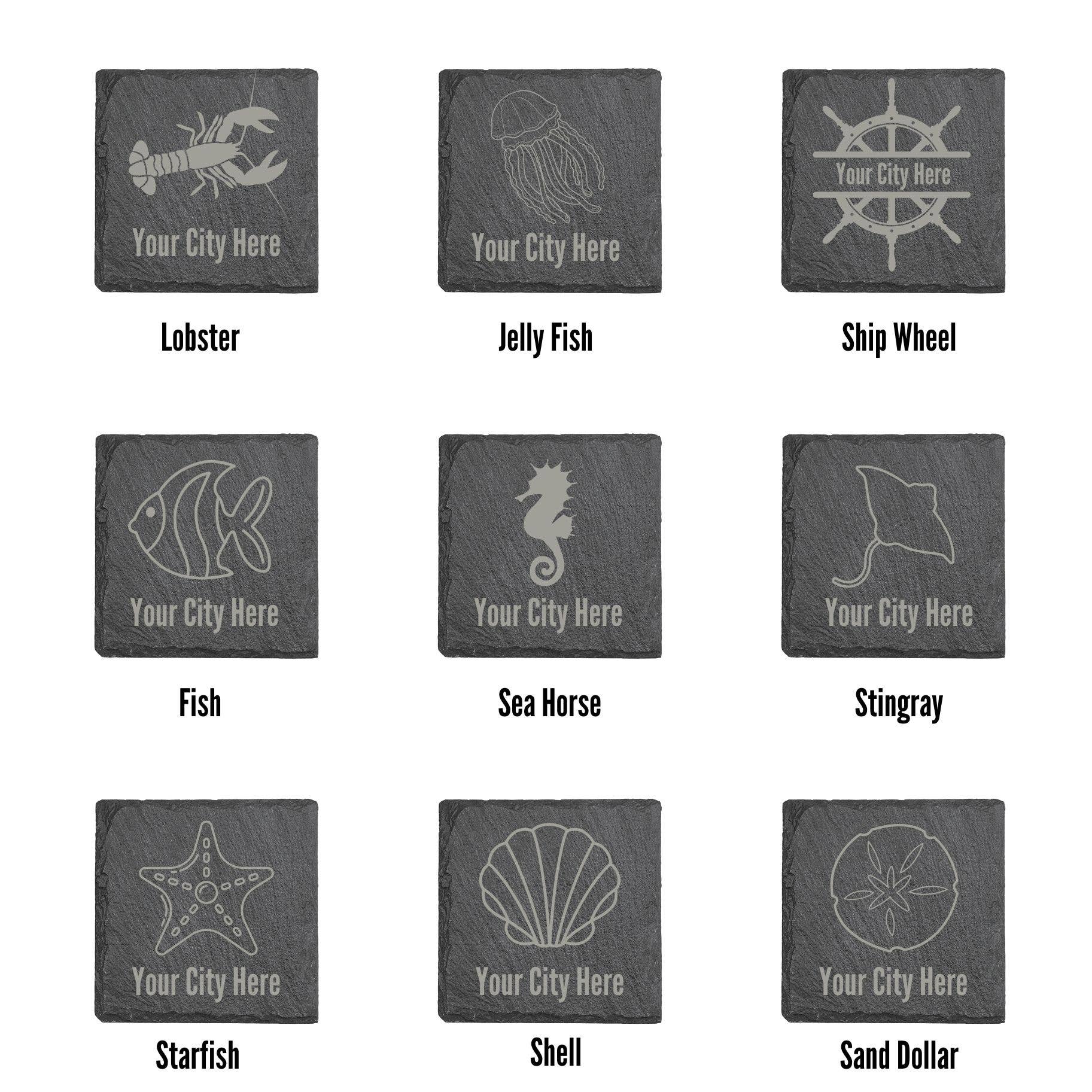 Engraved slate coasters with your options of Beach, Nautical or Ocean Animal. Name drop included for no additional fee.